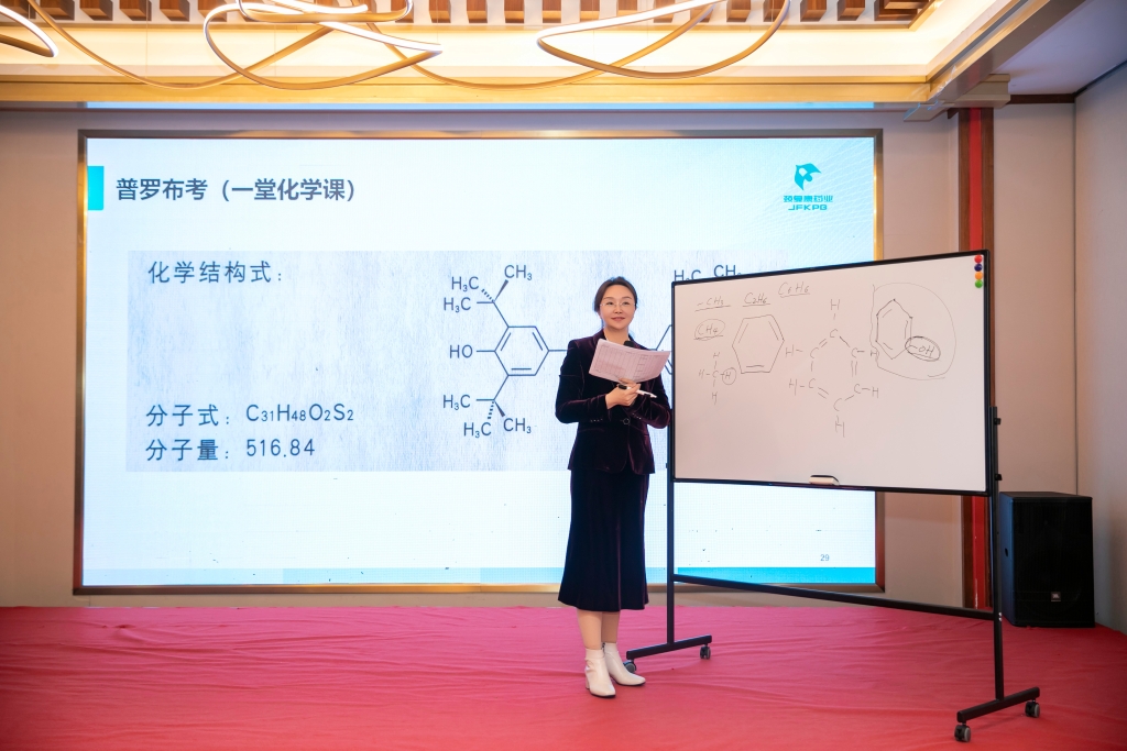 隨后總經(jīng)理王軼超通過一堂生動的化學(xué)課,向大家講解基礎(chǔ)有機化學(xué)知識,拆分普羅布考分子結(jié)構(gòu)式,增加大家對產(chǎn)品的了解。